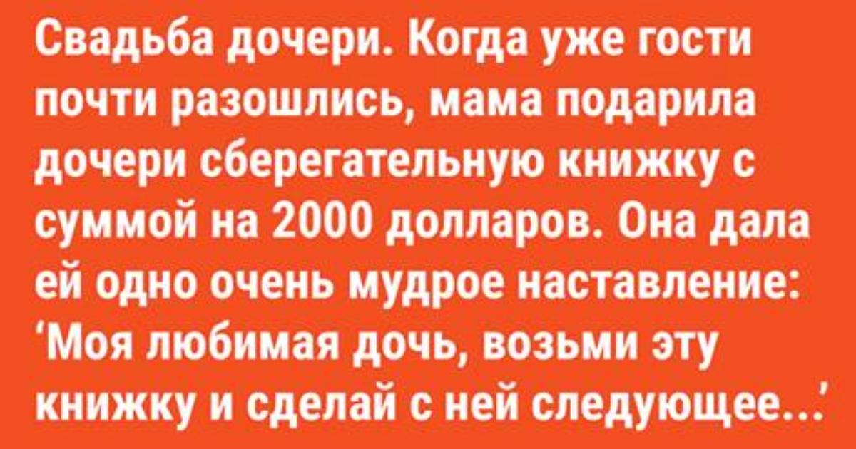 Свадьба дочери. Когда уже гости почти разошлись, мама подарила дочери сберегательную книжку с суммой на 2000 долларов.