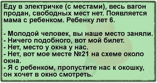Еду в электричке (с местами), весь вагон продан, свободных мест нет. Появляется мама с ребенком. Ребенку лет 6.