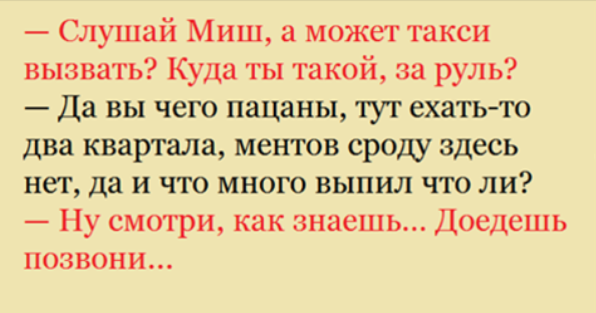 — Слушай Миш, а может такси вызвать? Куда ты такой, за руль?