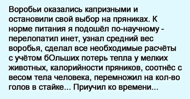 Да и фашикам назло, ибо живу в Эстонии.Воробьи оказались капризными и остановили свой выбор на пряниках. К норме питания я подошёл по-научному – перелопатил инет, узнал средний вес воробья, сделал все необходимые расчёты с учётом бОльших потерь тепла у мелких животных, калорийности пряников, соотнёс с весом тела человека, перемножил на кол-во голов в стайке… Приучил ко времени…