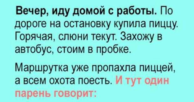 Вечер, иду домой с работы. По дороге на остановку купила пиццу. Горячая, слюни текут. Захожу в автобус, стоим в пробке. Маршрутка уже пропахла пиццей, а всем охота поесть. И тут один парень говорит: «Девушка, вы или выходите, или мы вас загрызем». Ну я не растерялась: открыла коробку и поделилась со всеми.