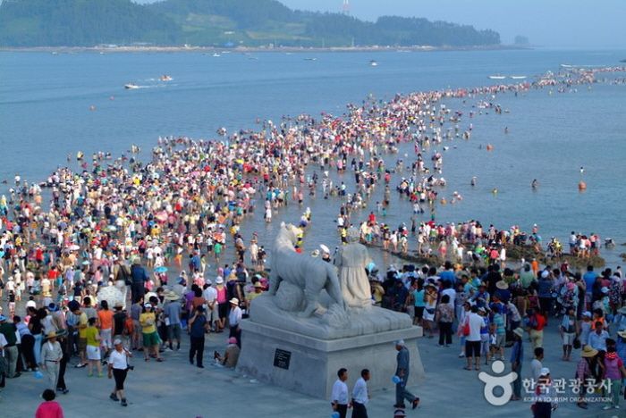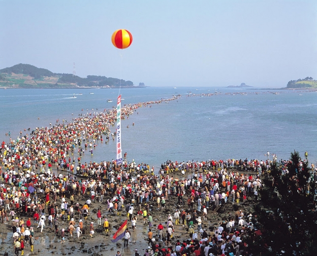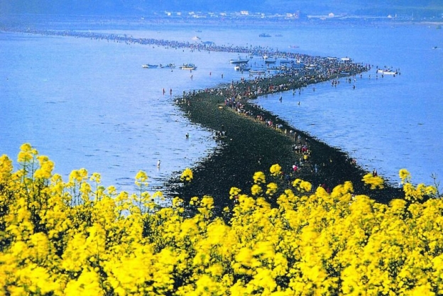 Два раза в год неподалёку от острова Чиндо в Южной Корее можно наблюдать удивительное явление, которое напоминает библейский сюжет о том, как перед Моисеем расступилось море. Воды, соединяющие острова Модо и Чиндо, на целый час расступаются, открывая дорогу протяжённостью в 2,8 километра и шириной в 40 метров.