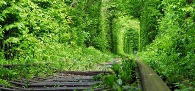 Тоннель сделан из леса, который тянется 1 км. А находится он на железной дороге в Ровненской области.
