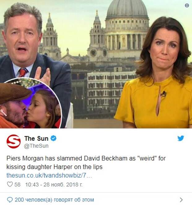 Некоторые пользователи назвали странным, что Бекхэм выражает привязанность к дочери поцелуем в губы.Вскоре к «хейтерам» присоединился и скандальный британский ведущий Пирс Морган, который поднял этот вопрос в своём утреннем шоу «Good Morning Britain».