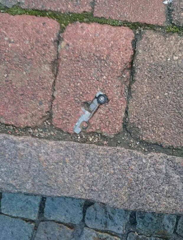 В тротуарную плитку вмурован игрушечный автомобиль.